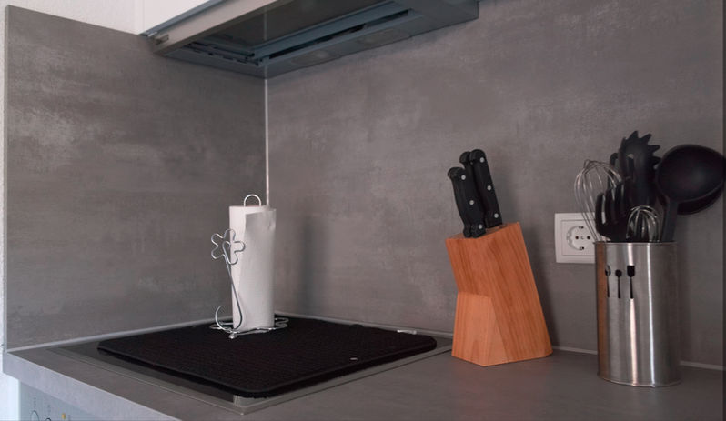 Dining table, coffee machine, cleaning supplies, toaster, hob, oven, kettle, dishwasher, microwave, refrigerator
